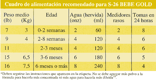 2. Cuadro para la preparación de mayores cantidades de S-26 BEBE GOLD.